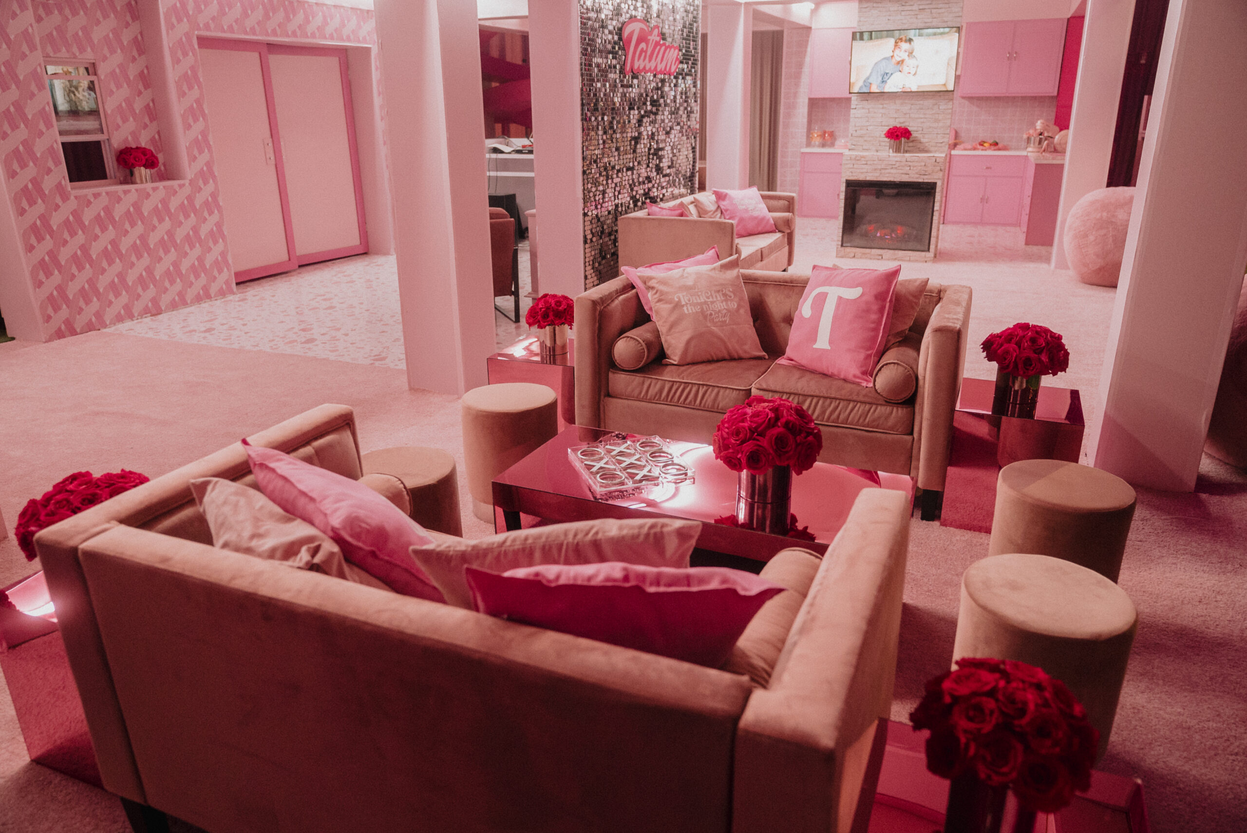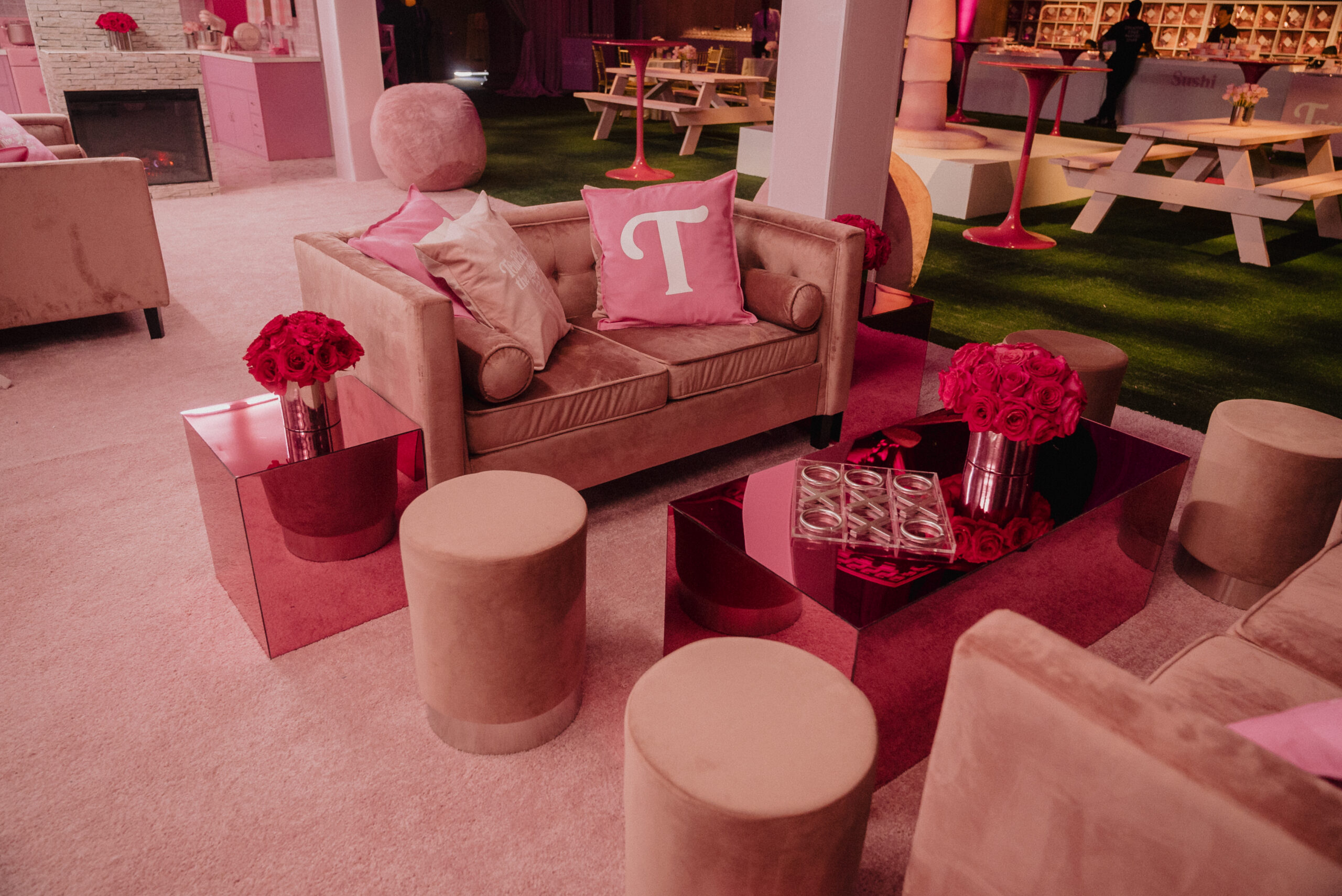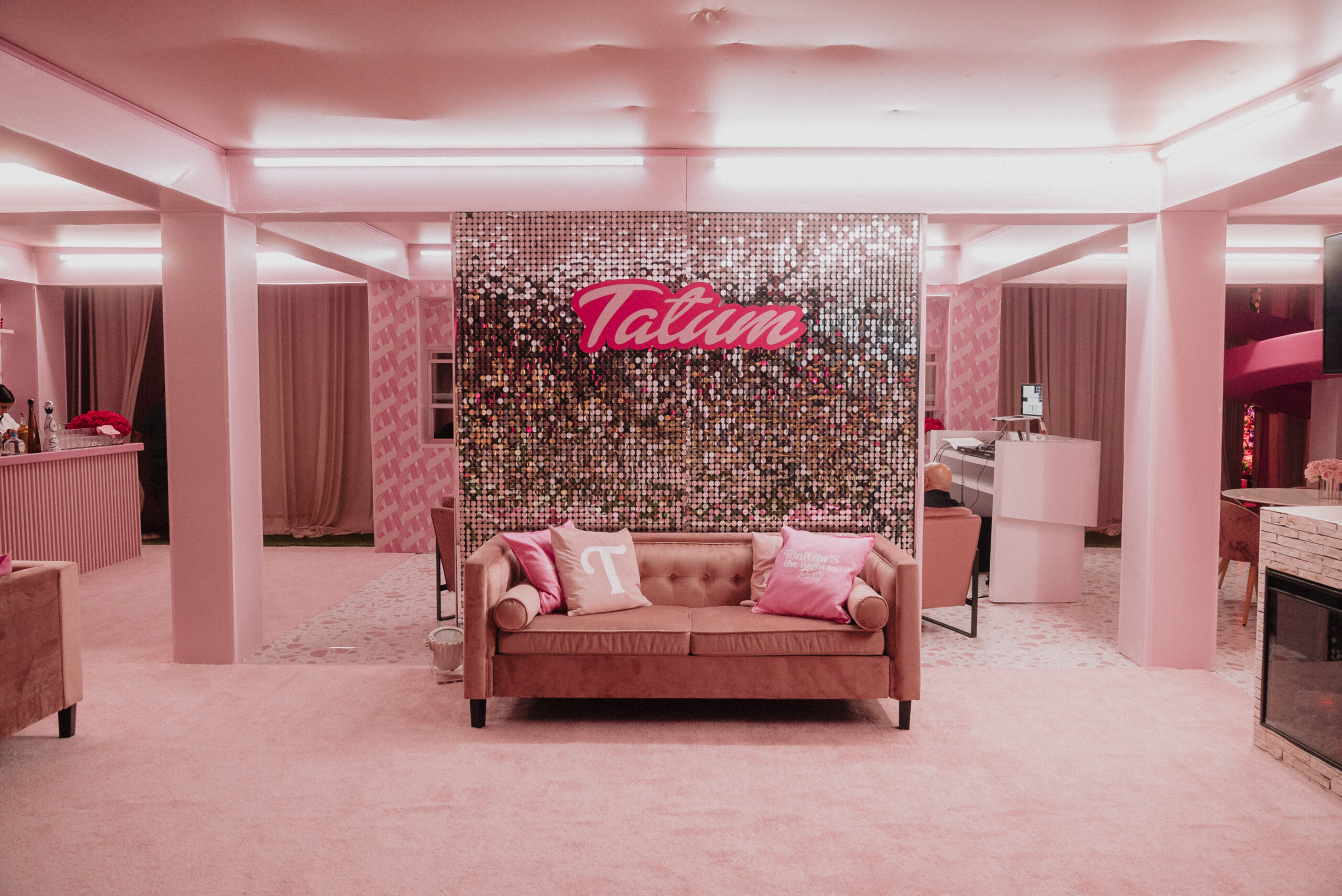 Bespoke Furniture & Decor: Every chair, table, and lounge piece was curated or custom-upholstered in varying shades of “Tatum Pink.”