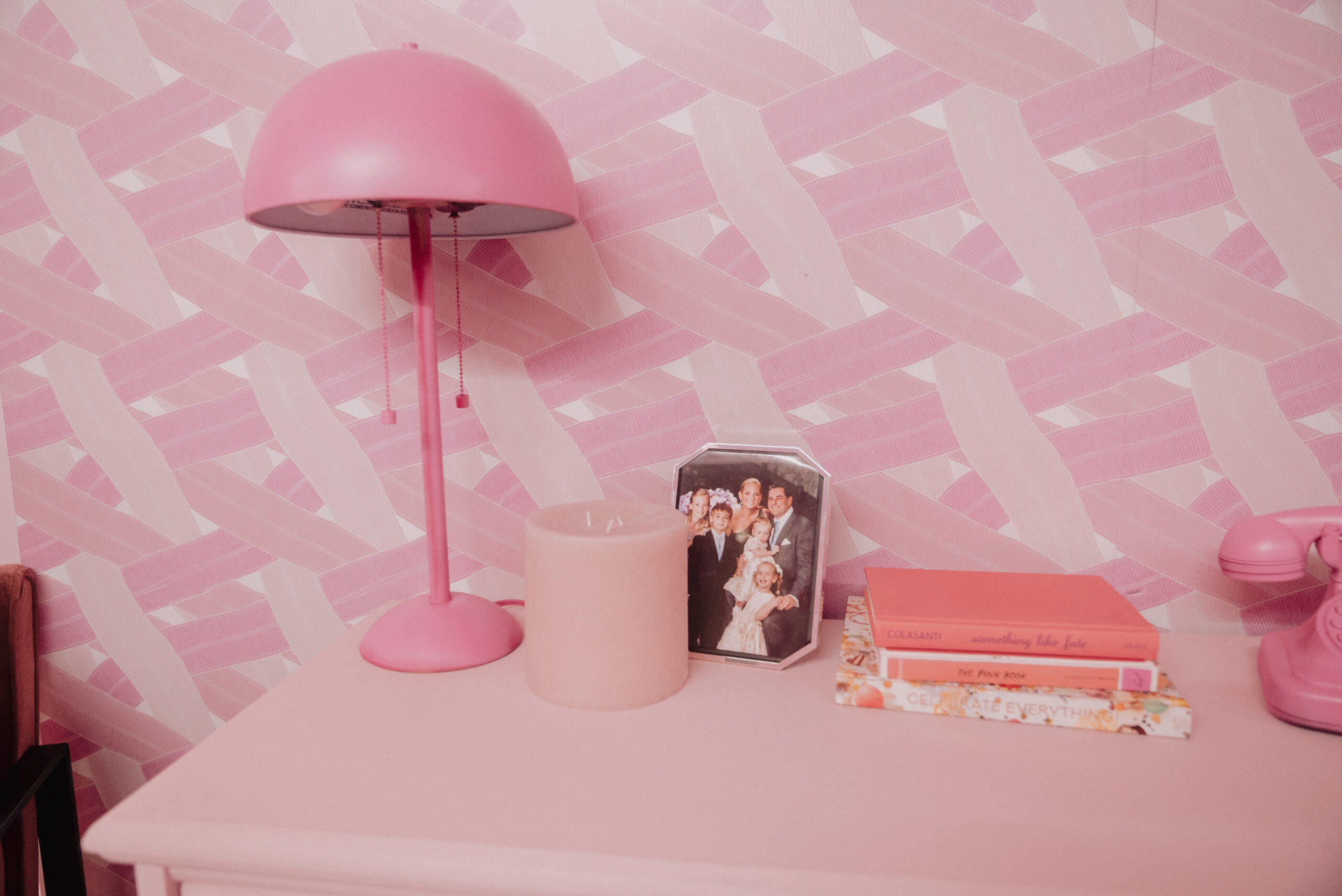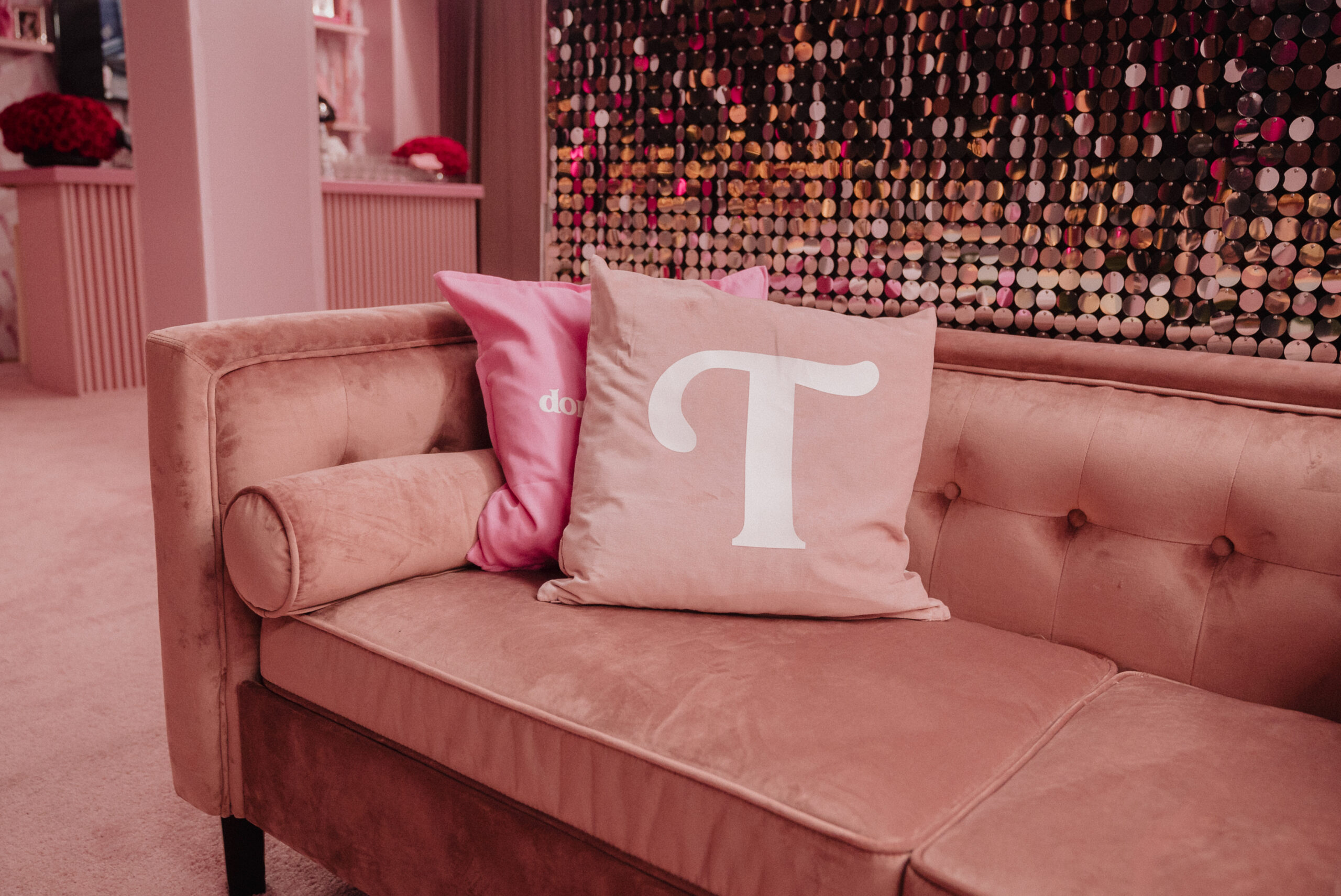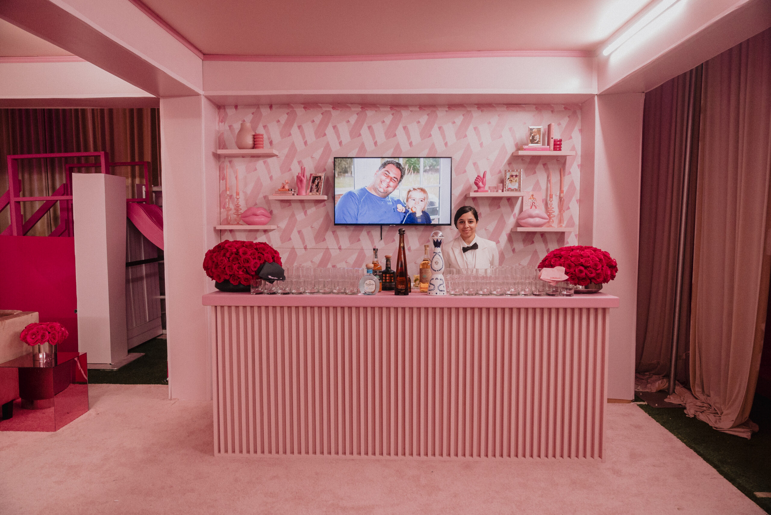 Bespoke Furniture & Decor: Every chair, table, and lounge piece was curated or custom-upholstered in varying shades of “Tatum Pink.”