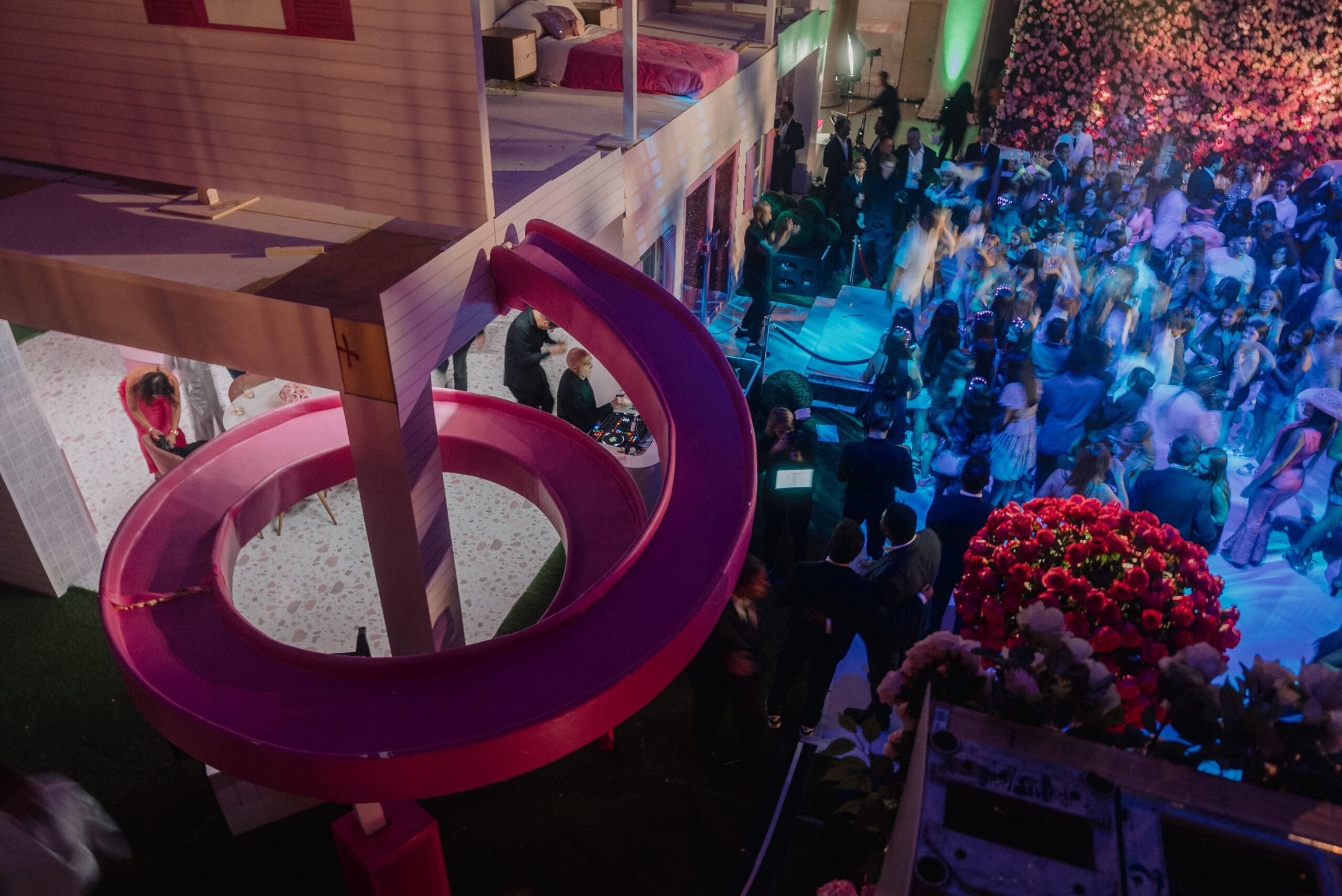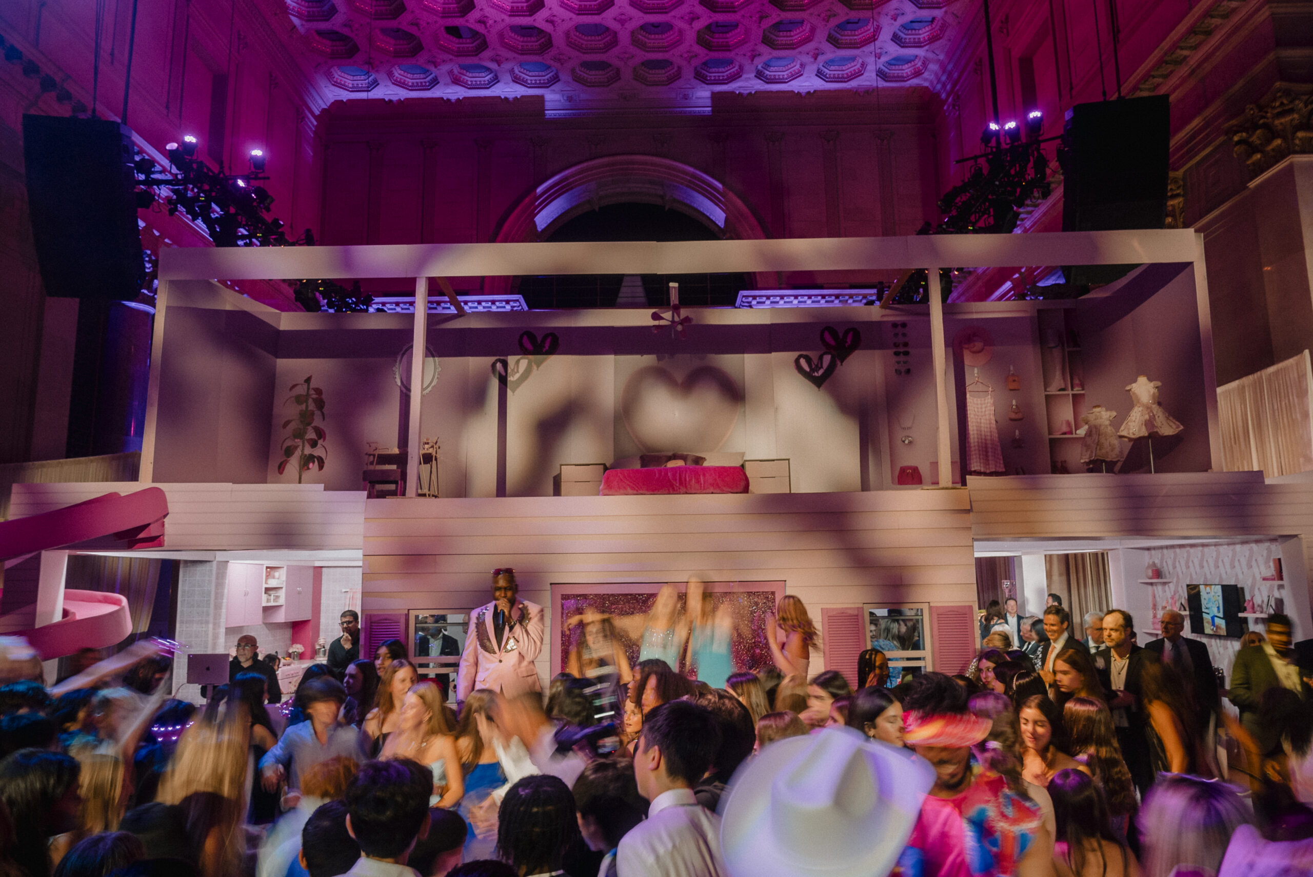 The engineering of a two-story structure inside a historic venue is no small feat. Our shop utilized specialized scenic fabrication techniques to ensure the “Dream House” was not only visually stunning but structurally secure for a high-energy party. We utilized CNC-routed panels, custom acrylic finishes, and integrated LED lighting to give the house that iconic “plastic-fantastic” toy-box sheen, all while scaling it to the 70-foot ceilings of Cipriani.
