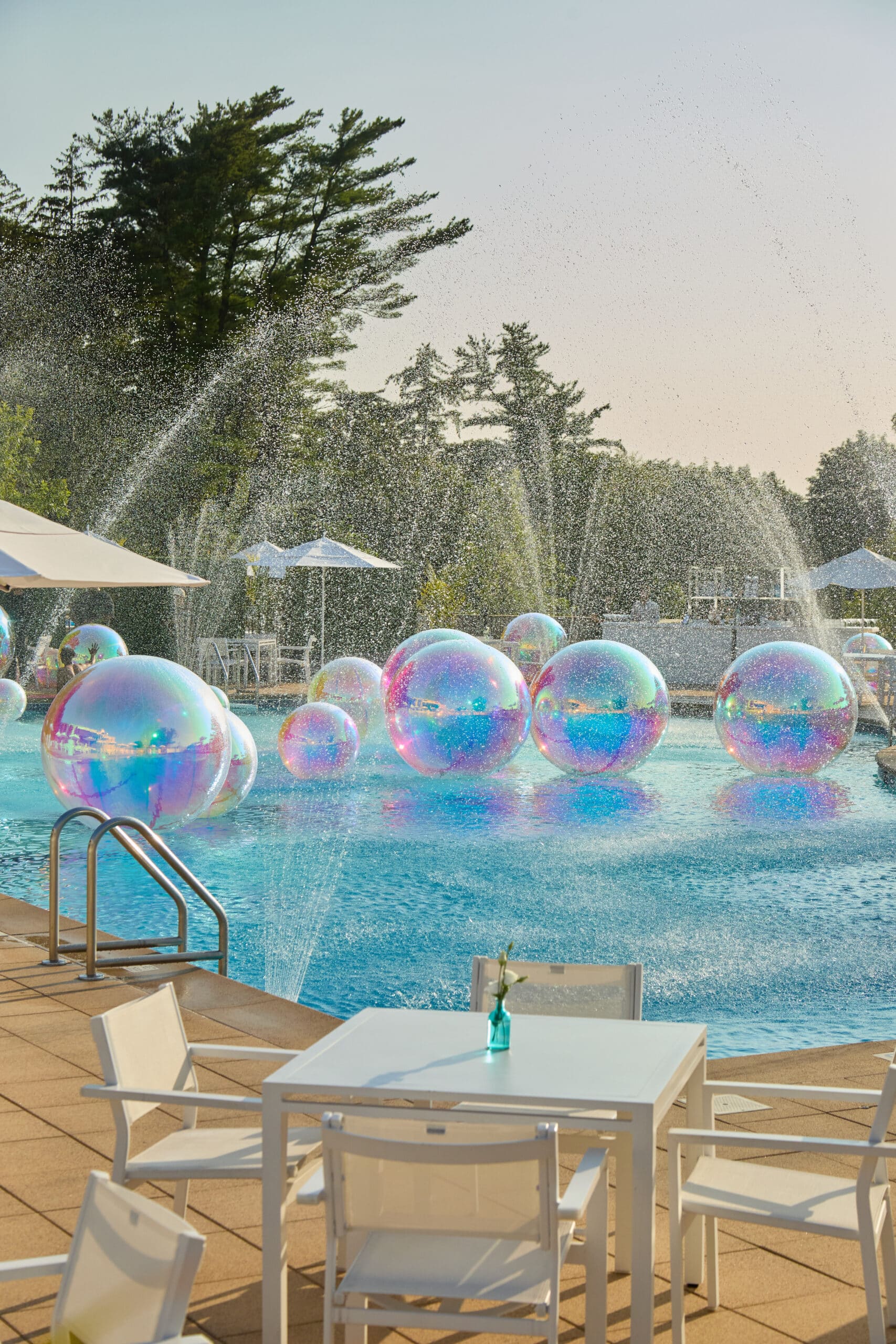 Water Scaping: We utilized the club’s pool as a canvas, deploying clear orb installations that caught the light and added a modern, ethereal layer to the water’s surface.