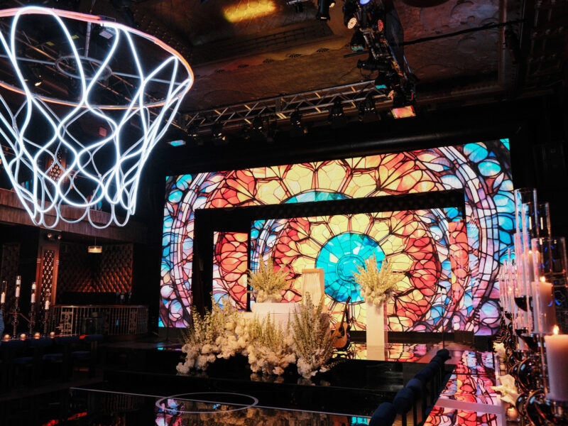 A basketball-themed life milestone event that elevated sports culture into an architectural celebration — complete with custom event fabrication, immersive branding, a suspended LED basketball hoop installation above the dance floor, bespoke lounge environments, and custom-fabricated dining surfaces. The event transformed a raw venue into an arena-meets-nightclub environment where every element — from the branded entry sequence to the illuminated centerpiece overhead — reinforced the “Ball Is Life” narrative.