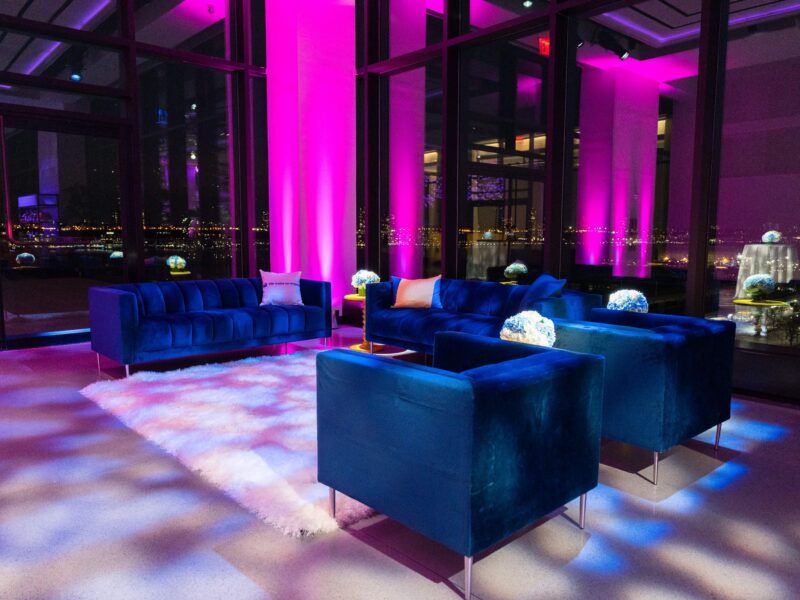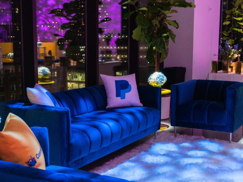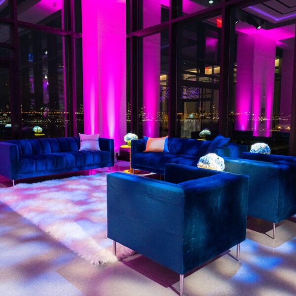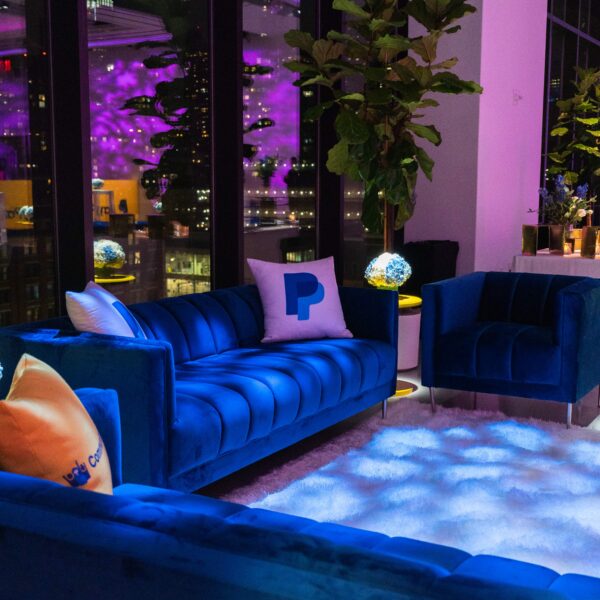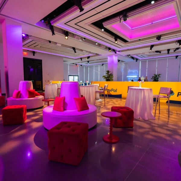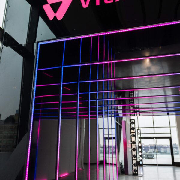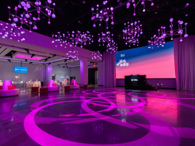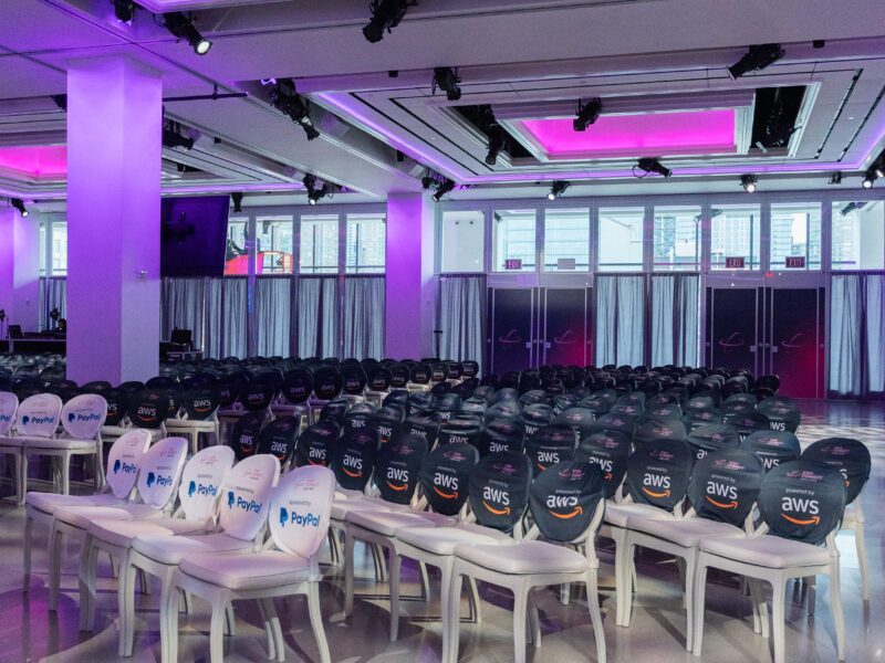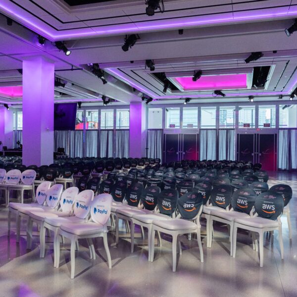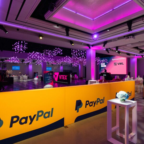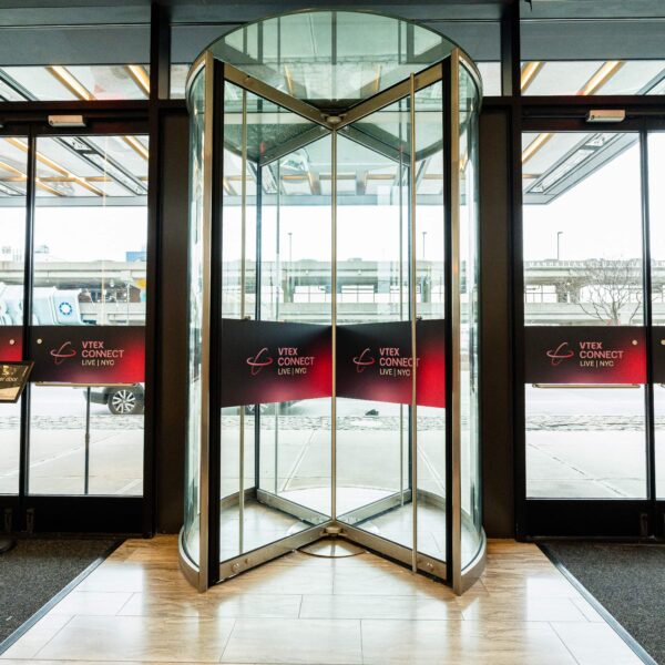 A corporate event for global commerce platform VTEX — designed as a brand immersion experience rather than a conventional conference reception. The Glasshouses’ industrial glass-and-steel architecture provided the structural canvas; our team layered custom scenic fabrication, branded environmental graphics, and architectural lighting to transform the venue into an extension of VTEX’s brand identity.