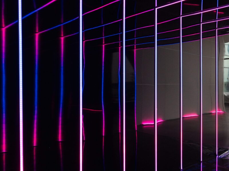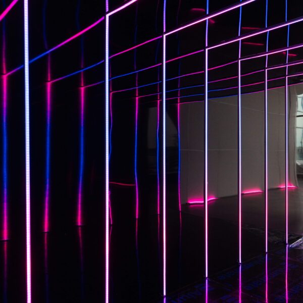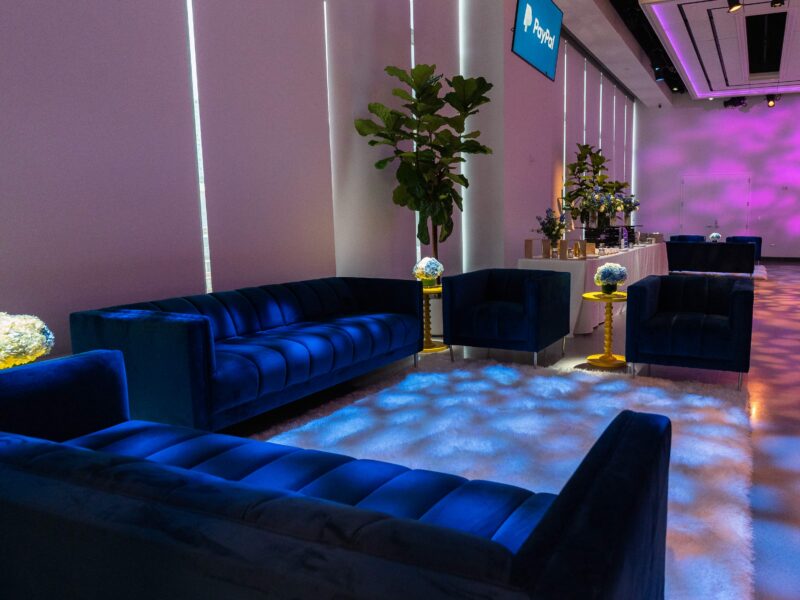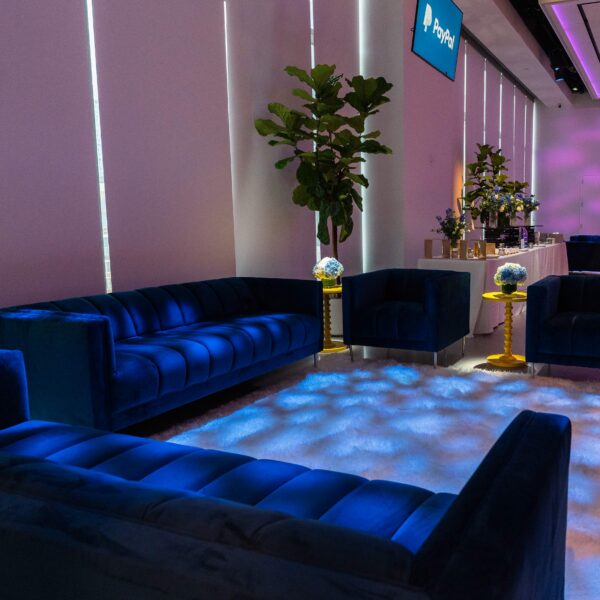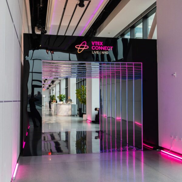 We designed the brand integration as a material conversation between VTEX’s identity and The Glasshouses’ architecture. Custom scenic fabrication used steel framing and industrial-finish surfaces that echoed the venue’s existing language, with VTEX’s branding expressed through dimensional signage, backlit graphics, and surface treatments that felt like architectural interventions rather than applied decoration. Spatial zoning was achieved through fabricated dividers, lighting shifts, and furniture configurations that created distinct experiential areas within the open floor plan — each with its own atmosphere while maintaining visual continuity across the full environment.