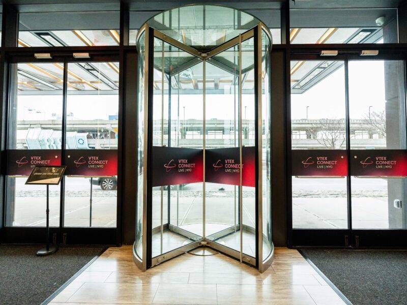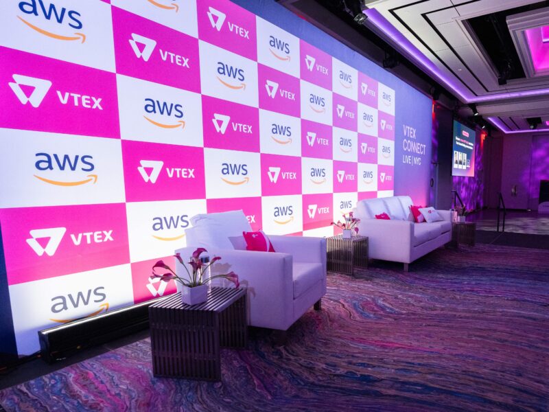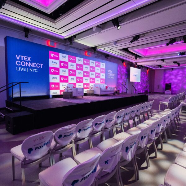 The production encompassed large-scale scenic installations, custom-fabricated brand touchpoints, purpose-built networking environments, and a staging configuration that supported both keynote presentations and intimate breakout conversations. Every fabricated element was designed to feel native to The Glasshouses’ industrial material palette — steel, glass, and concrete — while carrying VTEX’s brand language through dimensional signage, surface graphics, and integrated digital displays.